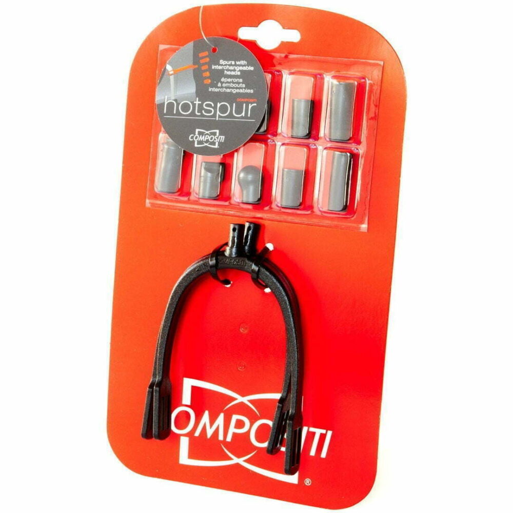 Σπιρούνια Compositi με 5 ανταλλακτικές κορώνες για κάθε ανάγκη στην αθλητική ιππασία, μέγιστη αντοχή, ειδικά διαμορφωμένο σχήμα, ώστε να μεταφέρεται η πίεση με πολύ μικρή κίνηση. Πολύ μεγάλης αντοχής πλαστικό υλικό κάτω από όλες τις καιρικές συνθήκες. Με την εγγύηση ποιότητας Compositi Belgium.