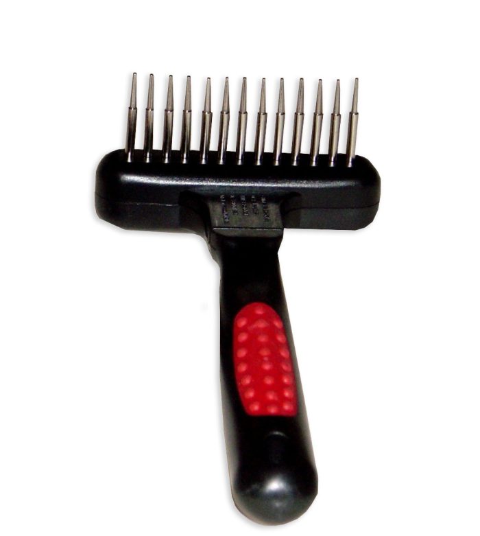 Αυτή η χτένα/τσουγκράνα έχει περιστρεφόμενα δόντια με στρογγυλοποιημένες άκρες που καθιστούν πολύ εύκολο να αφαιρεθούν απαλά κόμποι και νεκρές τρίχες από το υπόστρωμα της γούνας του κατοικίδιου σας.